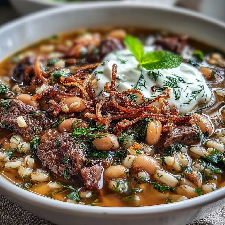 Crusty bread or Persian flatbread isn't optional—it's there to soak up every drop of broth, and honestly, it's my favorite part. This soup keeps beautifully in the refrigerator for up to four days, and the flavors actually deepen as it sits. The mint-fried onions are best made fresh each time, but if you're short on time, a crispy fried onion and a pinch of dried mint stirred into the sour cream works in a pinch.