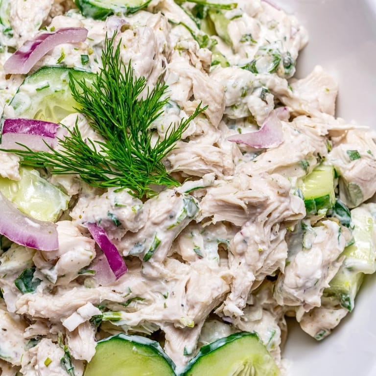Save The air conditioning had been fighting a losing battle all afternoon, and I was standing in my kitchen trying to figure out what to do with a rotisserie chicken Id picked up on impulse. Something cool and refreshing seemed like the only logical answer, so I started pulling cucumbers from the crisper drawer. This salad became one of those happy accidents—throwing things together based on what needed using and ending up with something that actually worked.